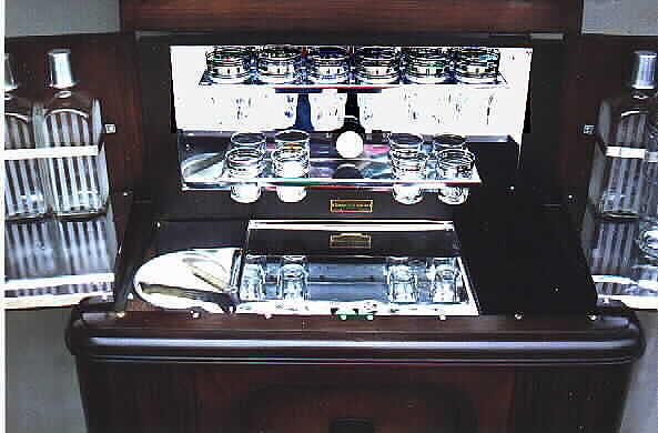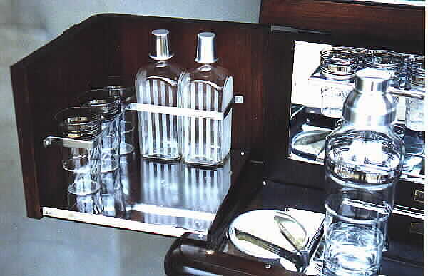A close-up of one of the swing out shelves showing the cocktail glasses, cocktail shaker, and two of the liquor decanters with their aluminum "shot" caps.