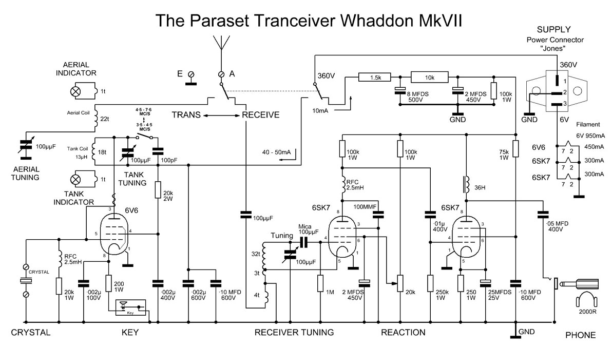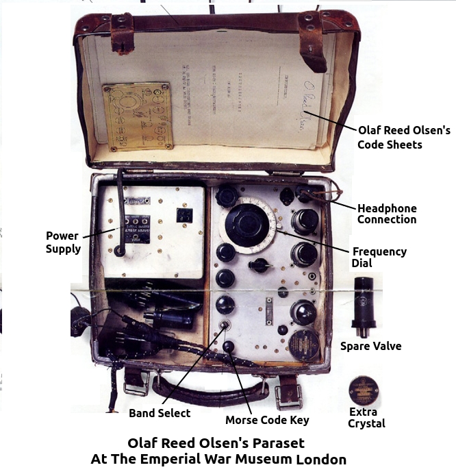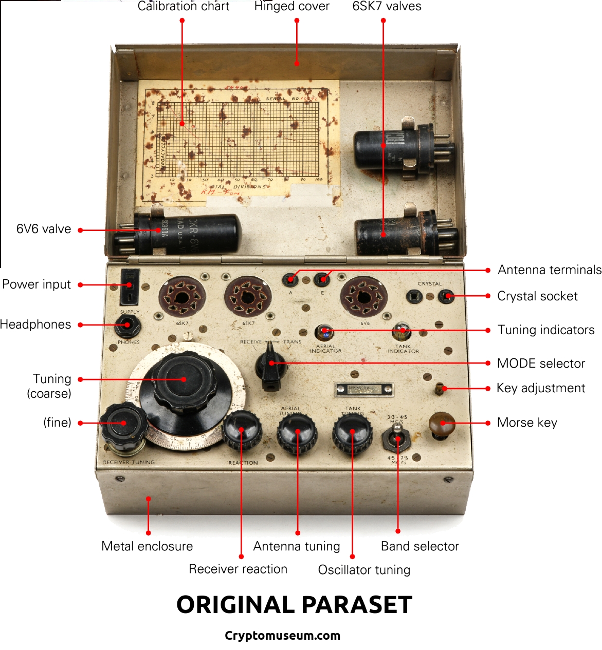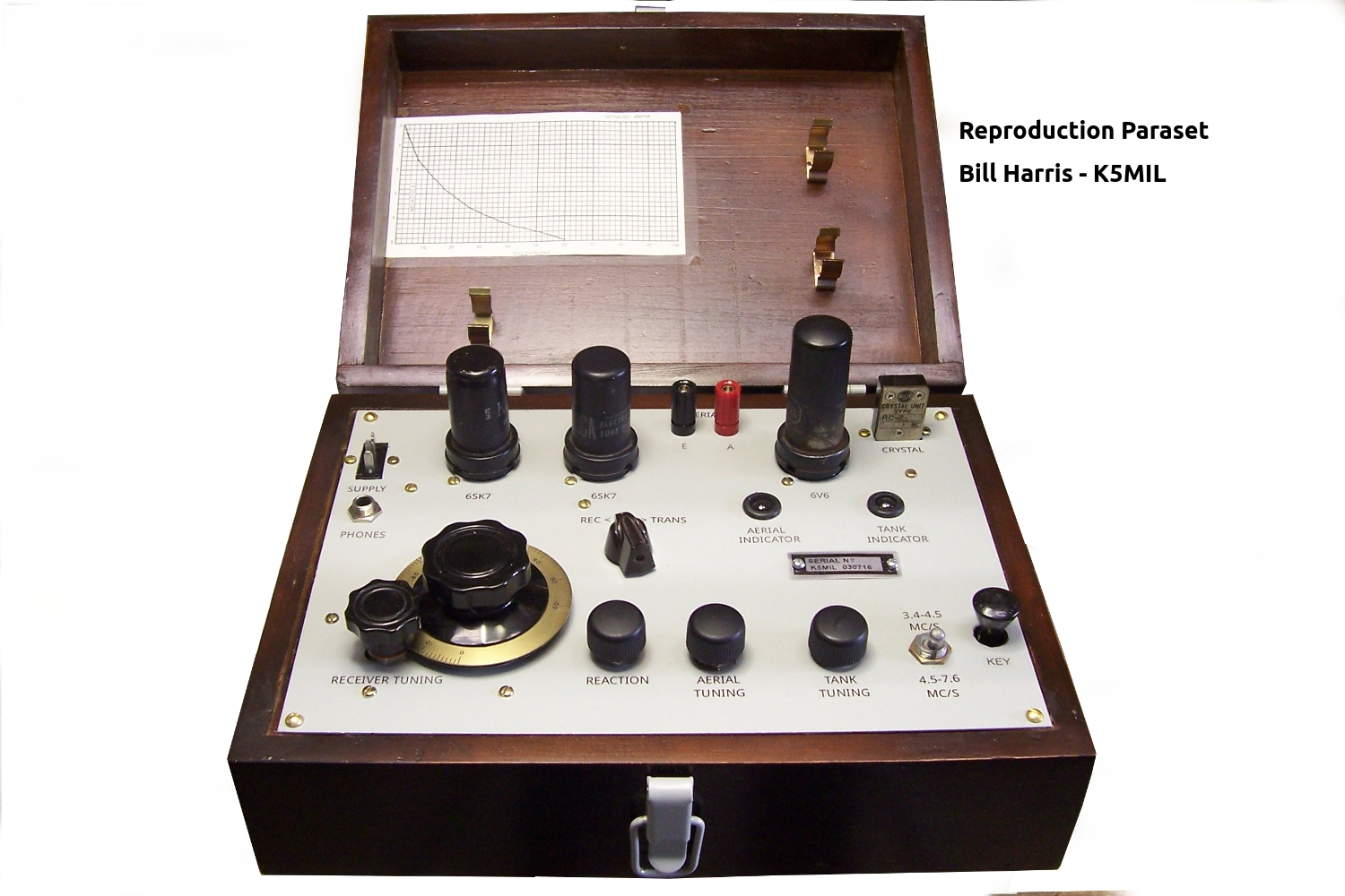 February 2024 Paraset" is a combination of the words radioset and parachute. The unit is a small, low-power, thermionic valve (vacuum tube) CW (Morse code) radio-transmitter-receiver, developed in Great Britain in the early stages of World War II. The set is known as the Whaddon Mark VII, or as simply the MK7 by MI6 (the British Secret Intelligence Service - Section 6), the SOE (Special Operations Executive), and was used for clandestine radio communication primarily in France (Free France Intelligence Service), Belgium and the Netherlands. It was the main set used by the agents in 1941-1942. The unit was developed at the Royal Signals Special Communications Unit workshops at Little Horwood and the workshops of Waddon Hall, Buckinghamshire, England. The equipment is known as the Paraset because of it's small size and light weight (for 1940's standards), it could be air-dropped by parachute or carried by agents being air-dropped. Resistance agents used the sets to communicate back to England on Nazi troop and ship movements as well as real-time weather conditions. Large antennas and powerful transmitters were used at Bletchley Park England which assured that agents could communicate with the little Parasets. The set here is a replica built to the same specifications as the original paraset. The circuit consists of a two tube regenerative receiver capable of tuning from approximately 3.0 MHz to 7.6 MHz, one band, and a one tube crystal controlled transmitter, coverage slightly more then the receiver, in two selectable bands. Output power of the transmitter is 3 - 5 watts. Two 6SK7 tube types are used in the receiver circuit, and a single 6V6 used as the crystal controlled transmitter. There is a jack for head phone use and a built in Morse code key. The first sets were built into wooden cases and later into metal “cash box” type cases. Power for the unit was provide by either battery powered portable vibrator type power supply or power supply using an AC mains source. Very few of the original units survive today. After the war radio equipment was ordered to be destroyed for fear it might fall into the hands of the Soviets. Fortunately, a few survived, there is one original in the British Museum in London, and a few originals in the hands of collectors. Many paraset fans, mostly Amateur (ham) Radio operators, have constructed reproduction sets and use them to make contacts on the ham radio bands. |