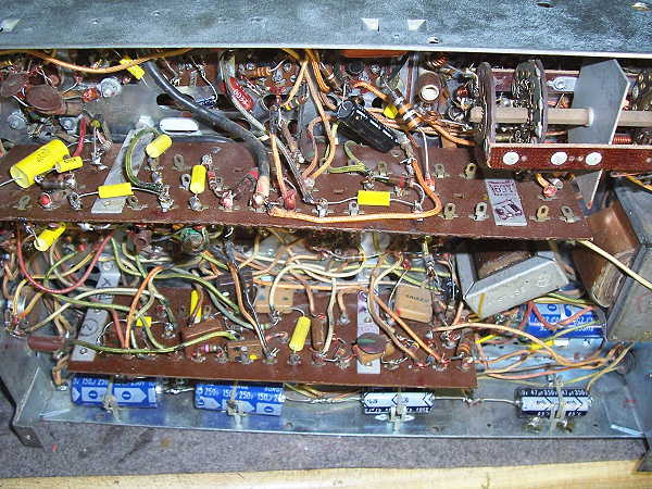 A decisions was made to go ahead and replace the remaining capacitors before proceeding with any more testing. This was quite a chore as there were a lot of capacitors and some were mounted on two vertical component boards as can be seen in the picture at left.