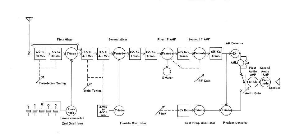 the 80 meter tuning range which becomes the first intermediate frequency. The second IF is 455 kc. There is no RF amplifier stage but the