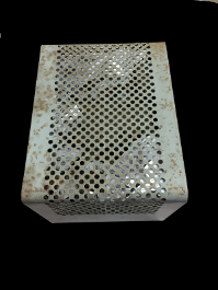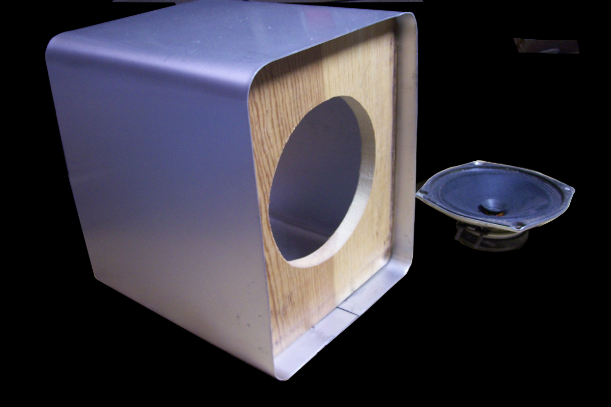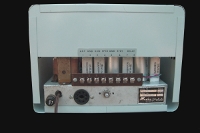 The cabinet was stripped and lightly sanded to remove any surface rust, and painted with "light gray" enamel paint, which is a very close match to the original color. The matching speaker was not included so a reproduction was fabricated from a piece of aluminum sheet. The final results are shown below. |