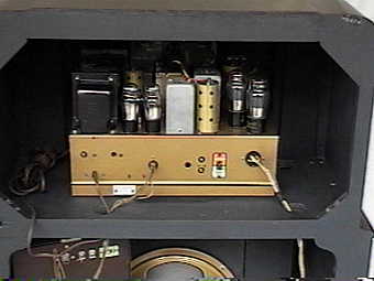 The next step was to tackle the chassis and replace all the capacitors. The filter capacitor was a cardboard tubular mounted under the chassis. The tube was opened and the old contents removed and new electrolytics were installed inside and sealed with hot glue. The contents were removed from all the paper bypass and coupling capacitors and new mylars installed inside the original containers. The photo below is a partial shot of the chassis showing the rebuilt capacitors.