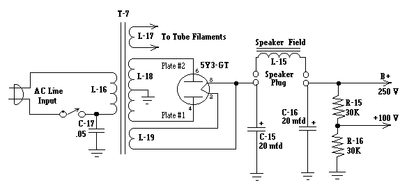 The Output Filter Capacitor - The output capacitor C-16 is subject to the same problems as the input capacitor. If it opens, there may little or no effect on the B+, but there may be an increase in the hum level, squealing, or motorboating in the receiver output. Substituting a new unit and observing the results is a quick check of this capacitor. If it shorts, the B+ voltage will be zero and excessive current will be drawn. Since it is after the choke (field coil L-15), the excessive current may cause damage to the coil. If the B+ voltage at the output filter reads zero, do not automatically assume the culprit is the capacitor, as the problem could be somewhere in the receiver circuits, such as a shorted plate or screen by-pass capacitor. When replacing this unit, observe the same cautions as the input capacitor, and always remove the old units from the circuit.