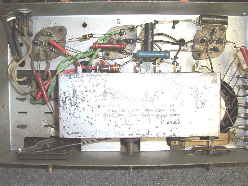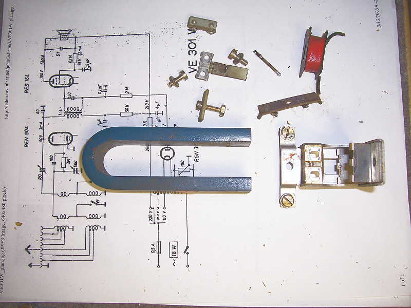 The chassis is transformer powered with taps on the primary to allow use on 220, 130, and 110 volts ac. The RGN 354 is a half wave rectifier, the filament voltage is taken from a tap on the high voltage secondary winding (see schematic). The case is dark Bakelite measuring 15 1/2 inches high, 11 inches width, and 6 1/4 inches deep. The circuit is a one tube regenerative detector using the REN 904 triode, audio is coupled from the REN 904 to the RES 164 audio amp through a 1:4 ratio interstage transformer.
