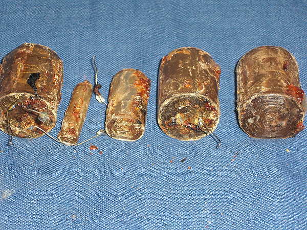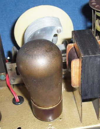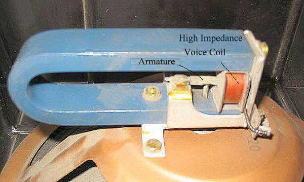 The speaker is of the high impedance voice coil type where the voice coil is in series with the B plus going to the plate of the output tube. The varying audio current through the voice coil acts on an armateur in the center of the coil. This armature is connected to the speaker cone via a small metal rod which transfers the motion of the armature to the speaker. No B plus is a good, or should I say bad, indication that the coil is open. A check with the ohm-meter confirms that it is indeed open and I am not too excited about the prospect of having to rewind the coil.