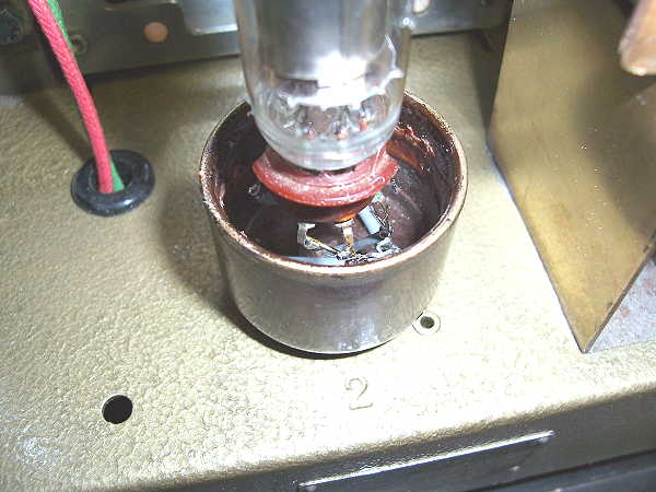 The element wires of the defective 904 were un-soldered from the tube base pins, the base was loosened and removed. A Dremel tool with a cutting disk was used to carefully cut the bottom of the glass envelope and remove the tube elements. Next a seven pin socket was wired into the base. The 904 and 164 require 4 volts on the filament and since the 3V4 only needs 2.8 volts, a 22 ohm resistor was wired inside the base in series with the filament which dropped the voltage to just under 2.8 volts.