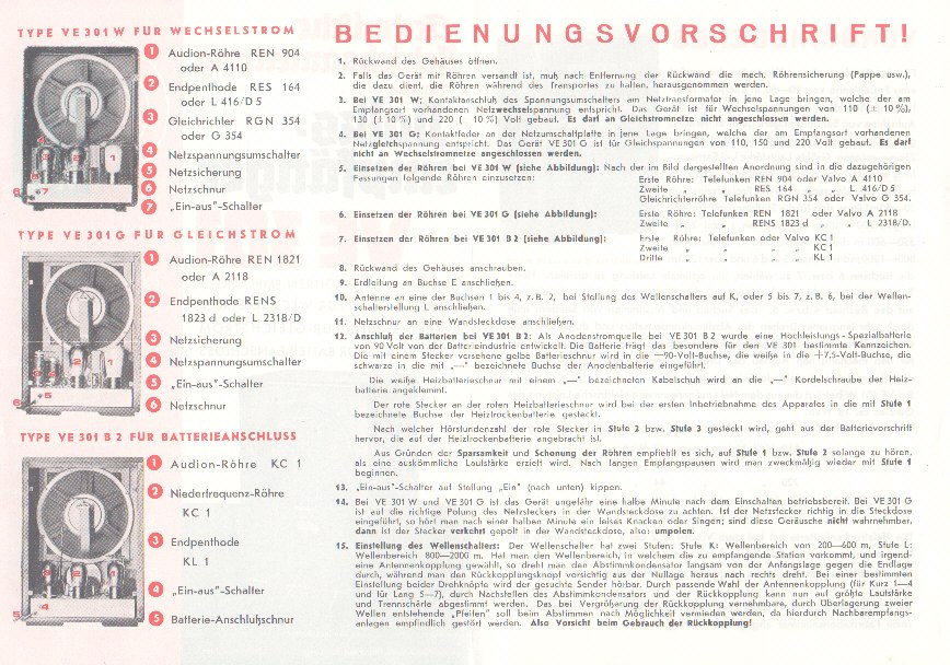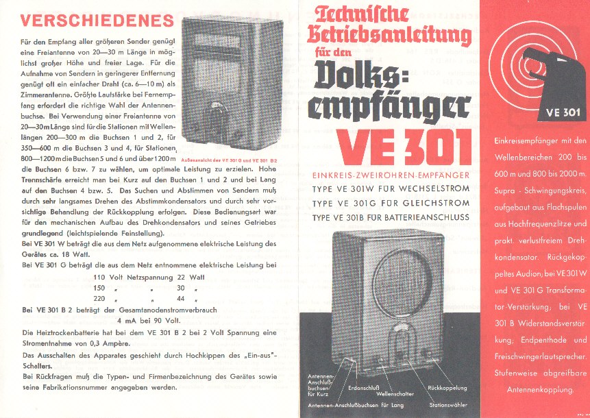 Below are pictures of the restored receiver along with some German language instructions and advertisement for the radio and a photo of a German family listening to their VE301.