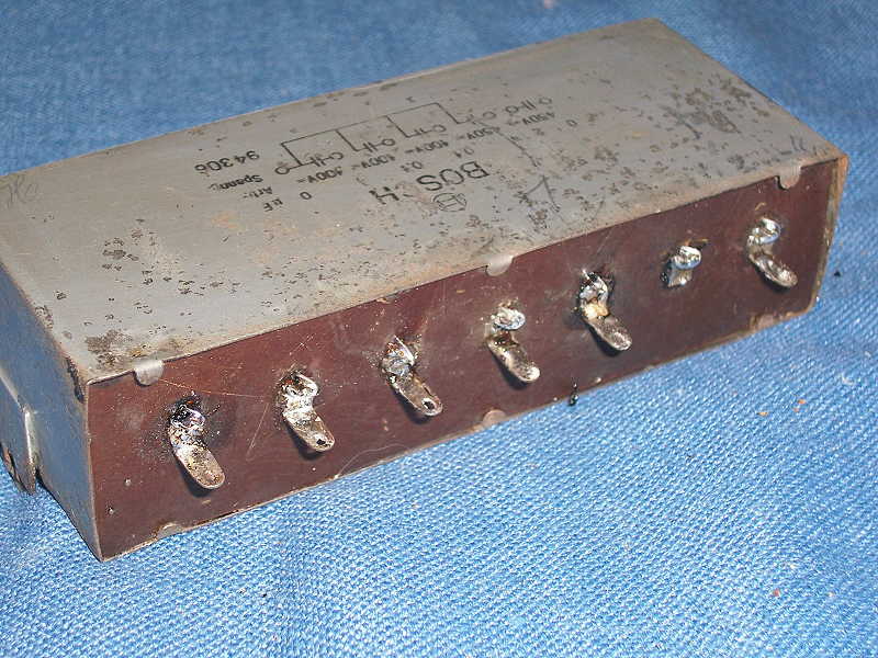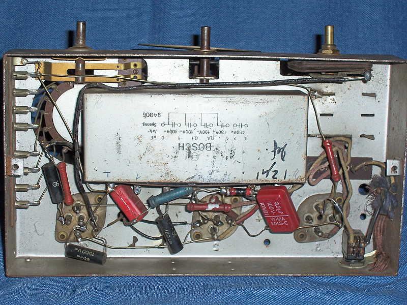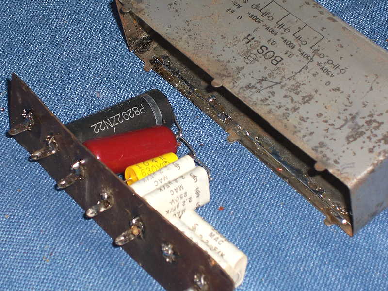 Attention is now turned to the large capacitor can that dominates the underside of the chassis. Luckily there is a diagram on the can giving the values and hookup of the capacitors to the terminals. The can is removed and the fold over tabs are opened and the cover removed along with the old capacitors. The old capacitors are removed and new capacitors installed in their place. The cover is replaced and sealed with the tabs and the can and is set aside as the screws that hold the tuning capacitor can only be accessed with the capacator can removed.