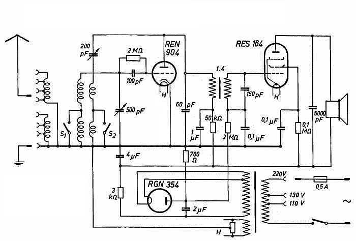 Tube line-up: RES 164 audio amp - RGN 354 half wave rectifier - REN 904 triode regen.